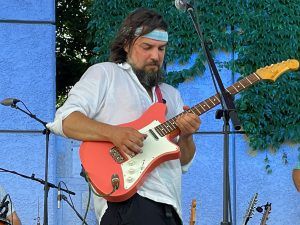 At the opening salvo of the United Bank Rogue River Blues Series at Rockford’s Garden Park, renowned guitarist Paul Nelson and his band delivered sizzling blues-rock riffs and solos for an audience that may have been half the usual size due to a heat index that topped 100 degrees, but it didn’t stop some fans and lots of kids from dancing on the handsome new dance floor in front of the stage.