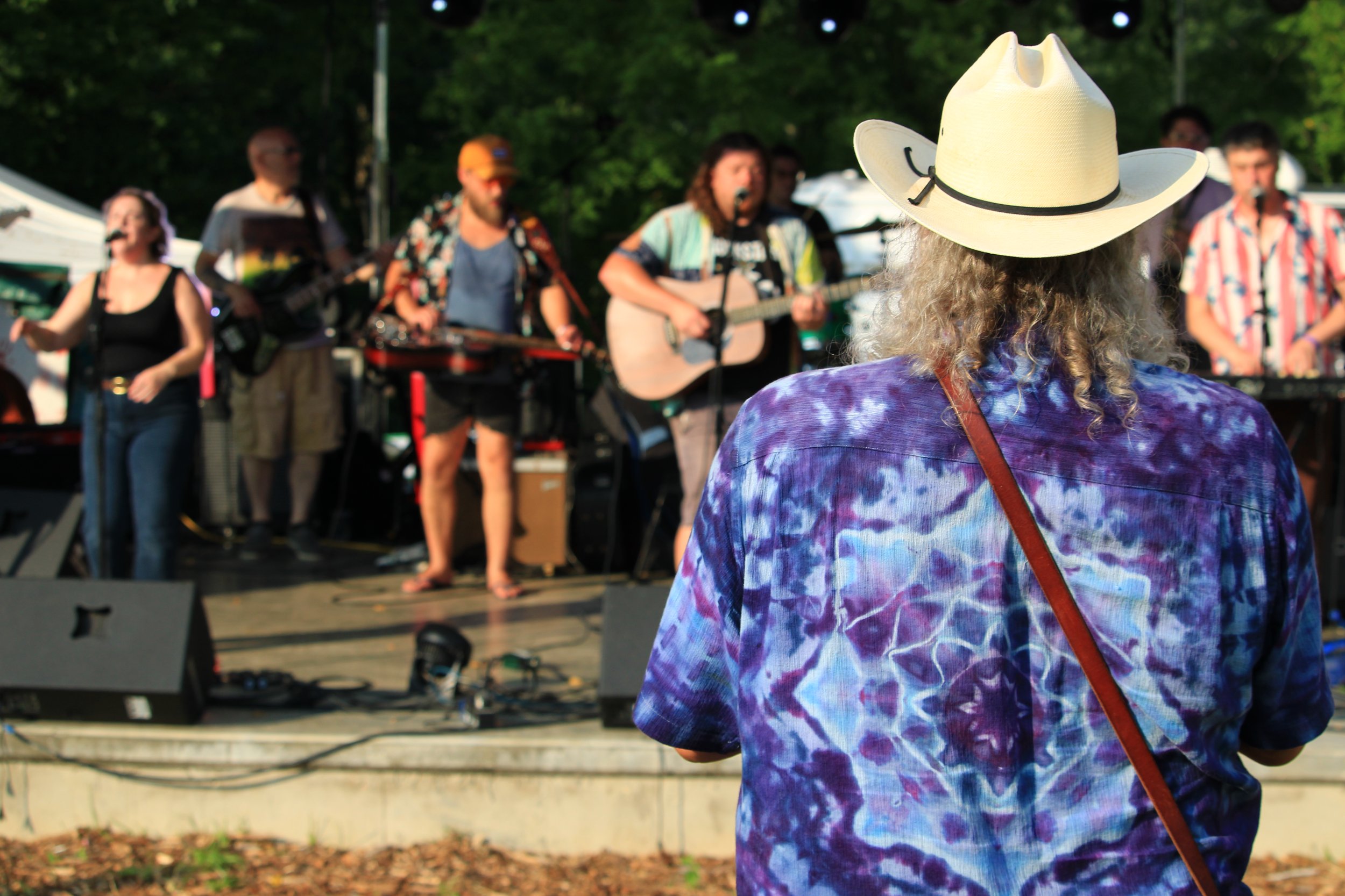 Sun-Drenched Strains: Shagbark Farm owner Farmer John Crissman looks on as Nathan Walton & The Remedy heat up the main stage. (Photo/Anna Sink)