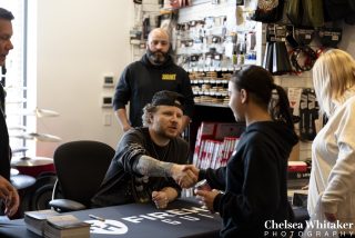 After about 1,000 people showed interest in attending the Firehouse Guitars / GearTree event via Facebook, nearly 150 were on hand at the beginning of the signing, with more showing up as the meet-and-greet continued — many dressed in previous Shinedown tour shirts, with vinyl, guitars and posters in-hand for Myers to sign.