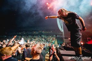 Seminal thrashers Anthrax offer a relatively jovial live experience. They opened their 40-minute set by quoting Pantera’s “Cowboys From Hell,” surely intended to be a tribute to recently passed drummer Vinnie Paul. Wisely, they segued into “Caught in a Mosh,” a vintage romp that brought the crowd to life. “Madhouse” and their hit cover of Trust’s “Antisocial” were tight and lively, with Joey Belladonna’s vocals showing some elasticity atop gangland-shouted choruses and Charlie Benante’s driving drum battery. They dug a little deeper into the catalog for their most inspired number, “Be All End All,” and roused the slam pit during set closer “Indians.”