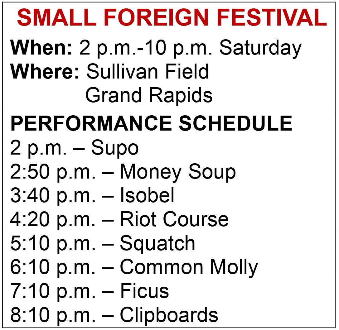 The free-admission festival starring Ficus, Clipboards, Common Molly, Squatch and several other West Michigan acts takes place at Sullivan Field, 650 Valley Ave. NW, with gates opening at 1:45 p.m. and festivities running until 10 p.m. Saturday.