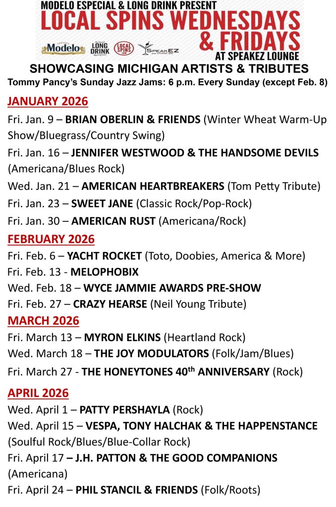 The series follows that with award-winning Detroit rock/roots/blues band Jennifer Westwood & The Handsome Devils on Jan. 16 and new Grand Rapids Americana act American Rust on Jan. 30, with the Tom Petty tribute American Heartbreakers in between. Future shows will feature appearances by popular Michigan-bred performers Melophobix, Myron Elkins, Patty PerShayla and more. SpeakEZ also hosts Sunday night jazz jams hosted by multi-instrumentalist Tommy Pancy, as well as regular tribute nights. A $5 surcharge is added to patrons’ tabs to help pay performers.
