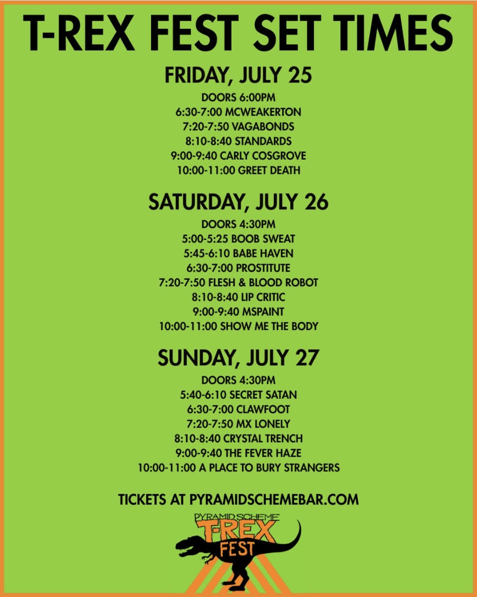 T-Rex Fest continues Saturday (July 26) with headlining sets from Show Me the Body and MSPAINT, and on Sunday (July 27) with A Place to Bury Strangers (billed as the loudest band in the world) and The Fever Haze. In all, 13 bands will perform over the next two days; view the schedule below.