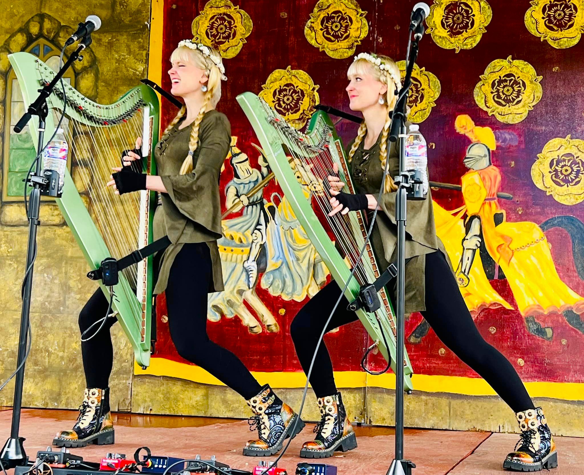 Performing on both floor-mounted and hand-held harps, the twins’ on-stage attire is almost always identical. For this tour they’re encouraging their all-ages audiences to come in family-friendly costumes.