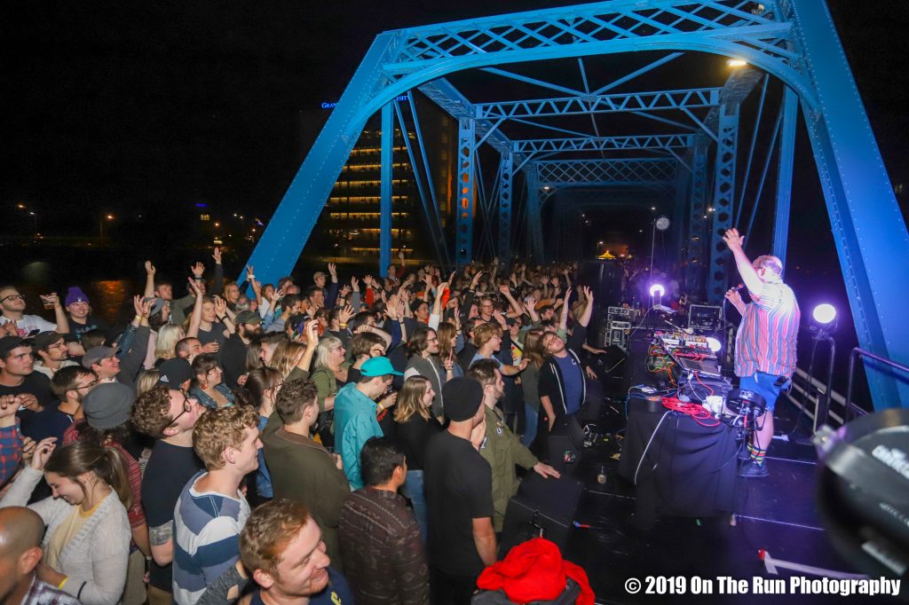 Saturday night boasted two shows in much different venues: While Colorado’s EOTO lit up Elevation inside Grand Rapids’ The Intersection, Baltimore composer and electronic music artist Dan Deacon (plus DJ ILL One, Cody Vizcarra and Lady Ace Boogie) packed the well-lit pedestrian Blue Bridge over the Grand River in downtown Grand Rapids as part of an unusual performance that’s part of ArtPrize’s Project 1.
