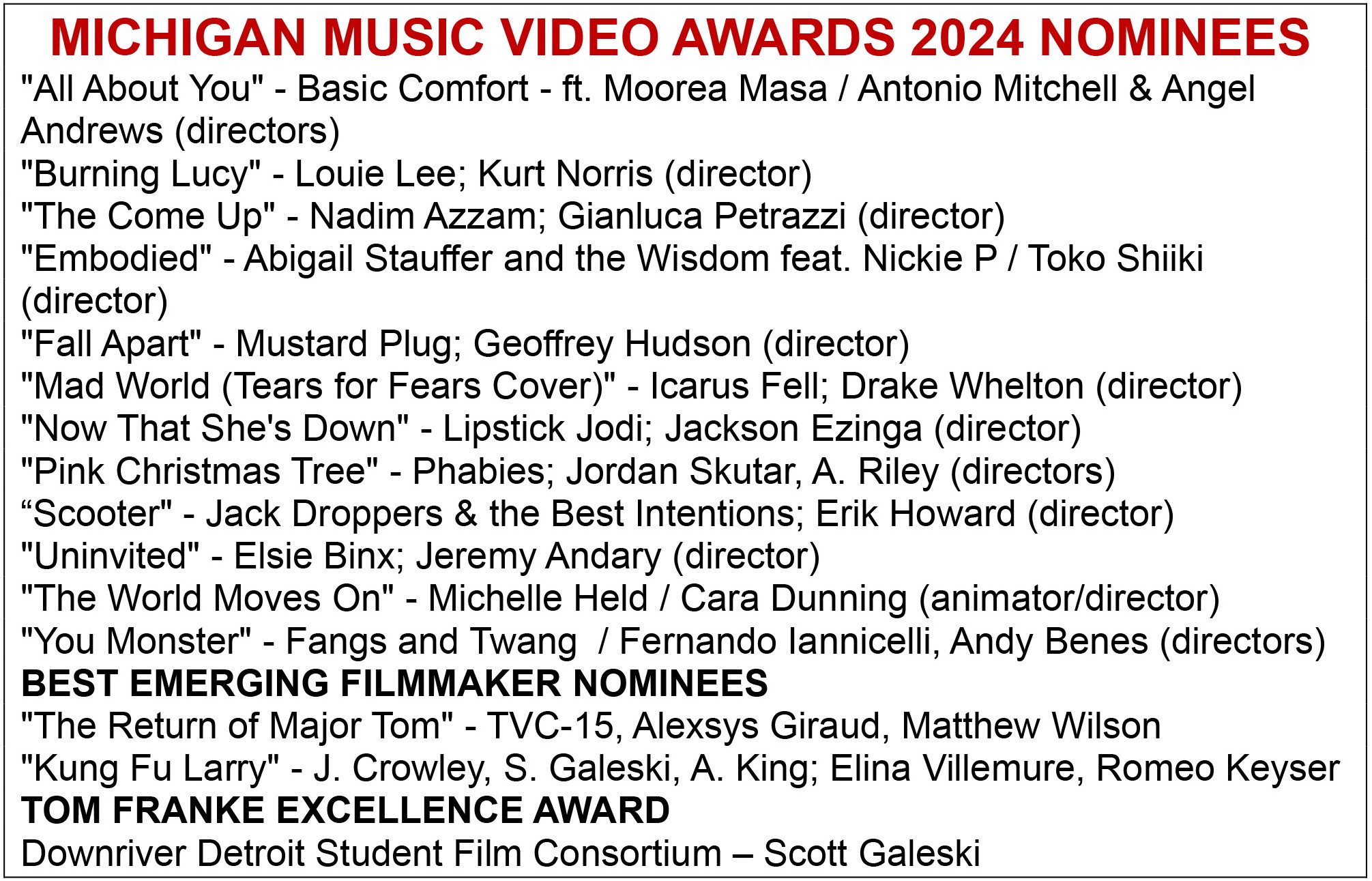 “We had about the same number of submissions this year as we did last year and were really pleased once again with the number and quality of the submissions. There are some fantastic music videos being made in Michigan, and we’re proud to provide a place where they can be showcased and recognized for their excellent work.”