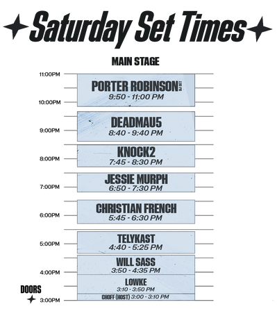 Porter Robinson, Deadmau5, Knock2, Jessie Murph, Lowke, Christian French and more are on the bill for today (Saturday), with Choff kicking things off at 3 p.m. One-day passes are $104, available online here.