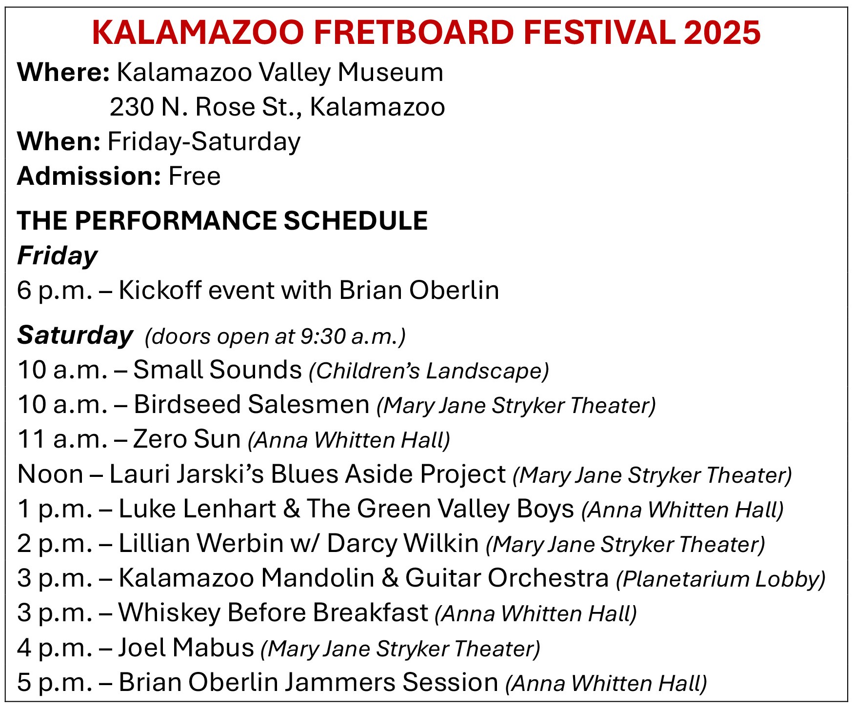 Sharing live music, displaying guitars, banjos and other instruments, and offering workshops on mandolin, slide-guitar, sound engineering and more will propel the 20th Fretboard Festival taking place Saturday (March 22) at the Kalamazoo Valley Museum, with mandolinist Brian Oberlin playing a kickoff event on Friday evening (March 21).