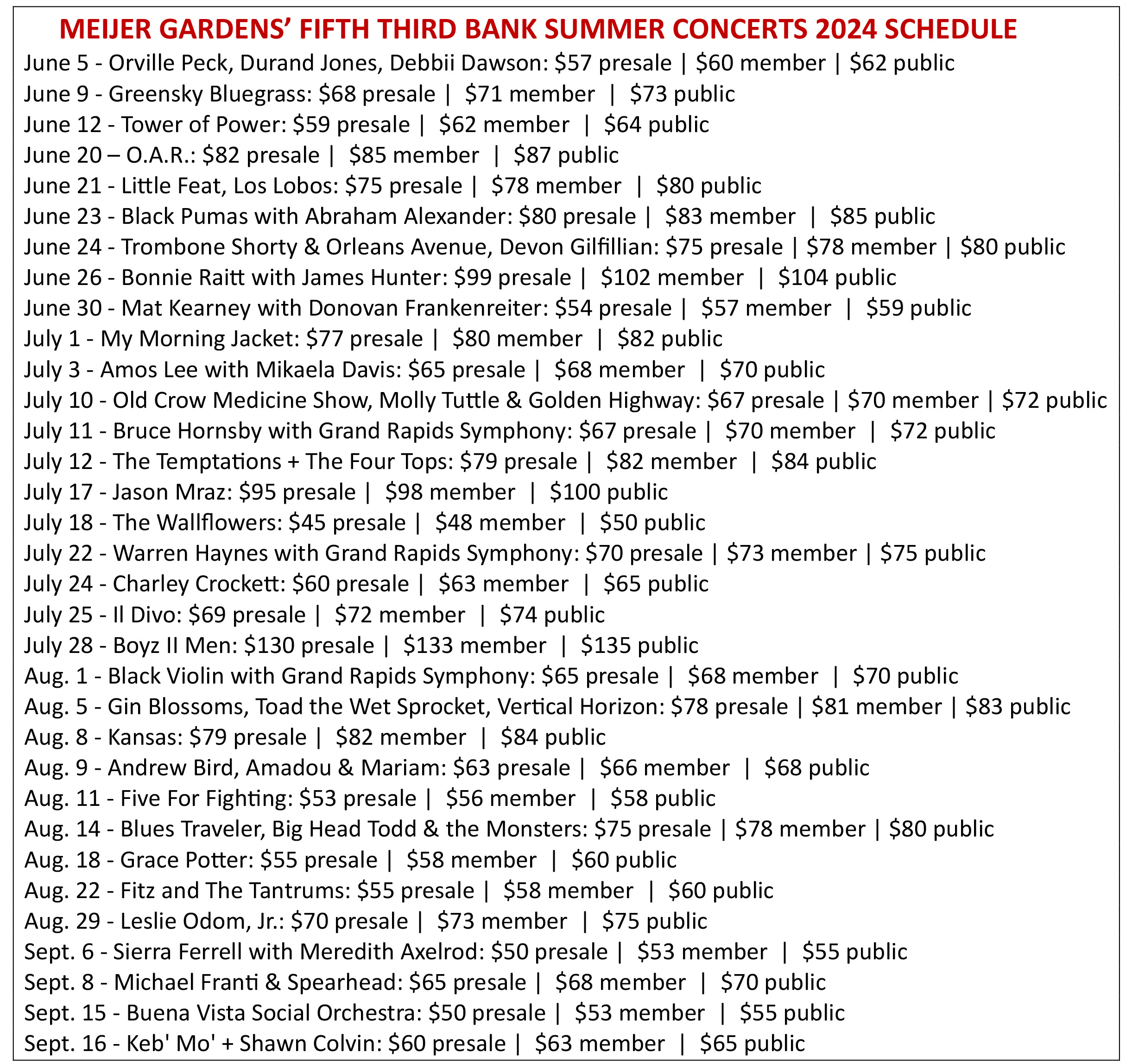 By comparison for 2024, Meijer Gardens unfurled a 33-concert lineup for the 1,900-capacity amphitheater’s 2024 season, with My Morning Jacket, Black Pumas, Blues Traveler, Leslie Odom Jr., Boyz II Men and Charley Crockett joining returning favorites such as O.A.R., Trombone Shorty, Bonnie Raitt, Michael Franti and Amos Lee on the expanded docket.