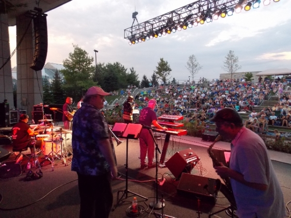 The mood of the crowd was as upbeat as the attitude of the musicians on stage, with children and couples twirling and dancing in front of the stage, families picnicking in the lawn seats and teenagers starting a conga line that weaved its way through the amphitheater.