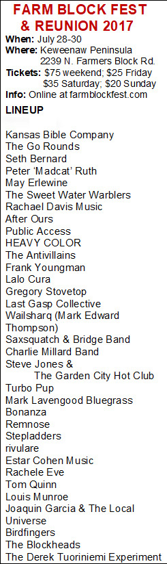 Part of that “adventuring” involves attending the Upper Peninsula’s Farm Block Fest and Reunion 2017, which recently announced its lineup for the event taking place in late July.