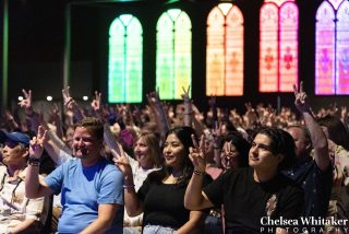 Christening The Big Room: The crowd of 1,200 with the venue’s stained-glass backdrop. (Photo/Chelsea Whitaker)