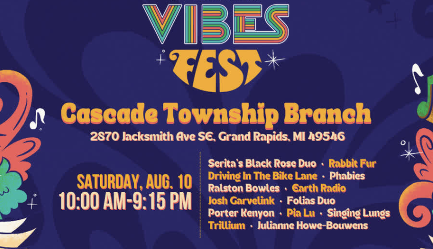 The 2024 Vibes Fest will feature performances by Serita’s Black Rose, Phabies, Earth Radio, Ralston Bowles, Porter Kenyon, Folias Duo, Rabbit Fur, Driving in the Bike Lane, Josh Garvelink, Pia Lu, Singing Lungs, Trillium and Julianne Howe-Bouwens. The event runs from 10 a.m. to 9:15 p.m. Aug. 10 at the Cascade Township Branch Library, 2870 Jacksmith Ave. SE.
