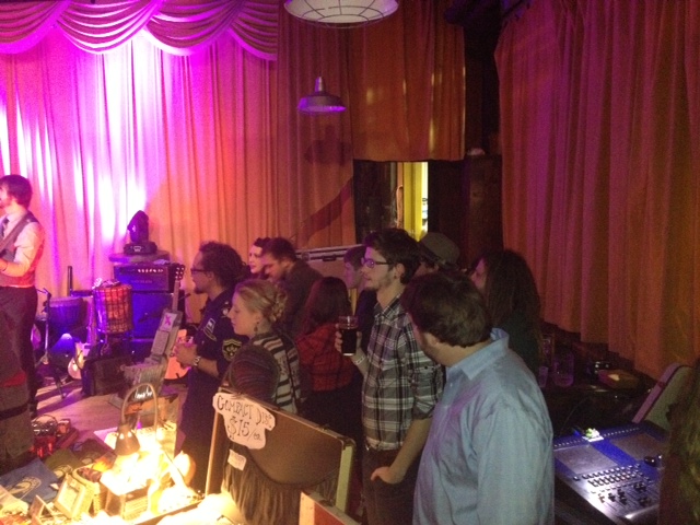 Cheers: The Crane Wives’ Dan Rickabus toasts the New Year early as Lindsay Lou & The Flatbellys perform at Founders. (Photo/John Sinkevics)
