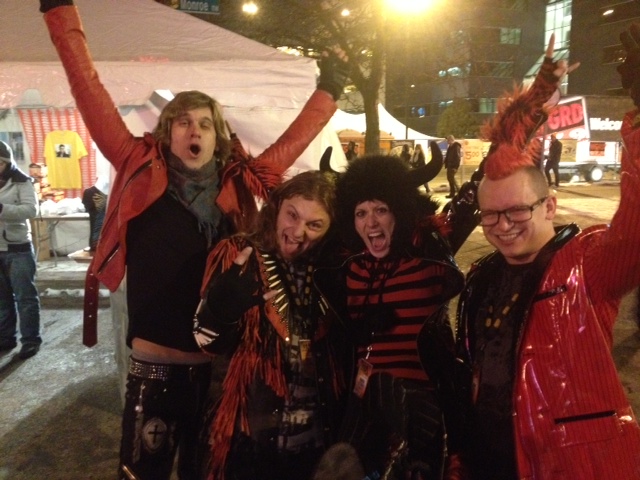 A party vibe: Members of The Outer Vibe celebrate after their high-energy set at the Hot New Year’s Eve show downtown.