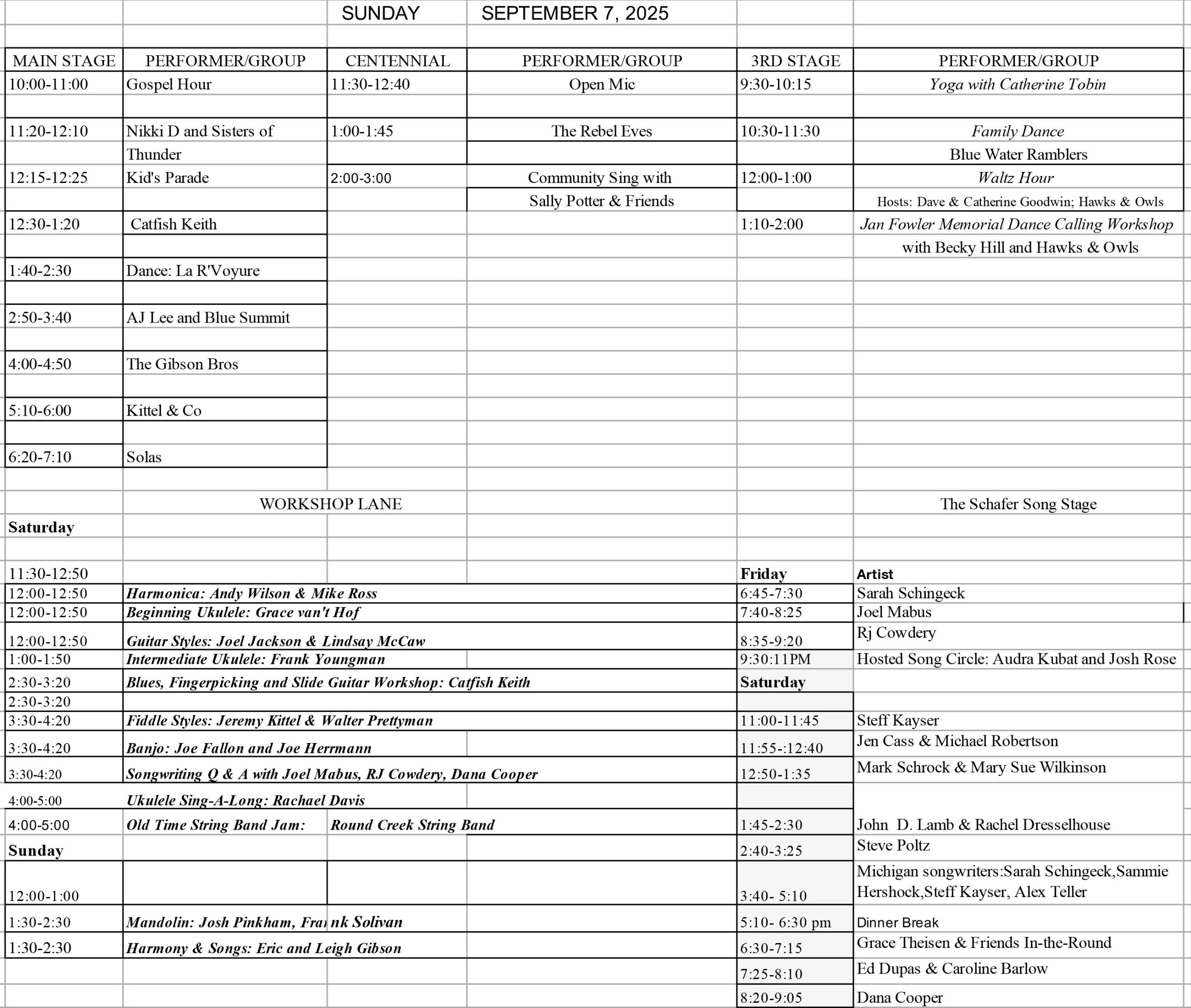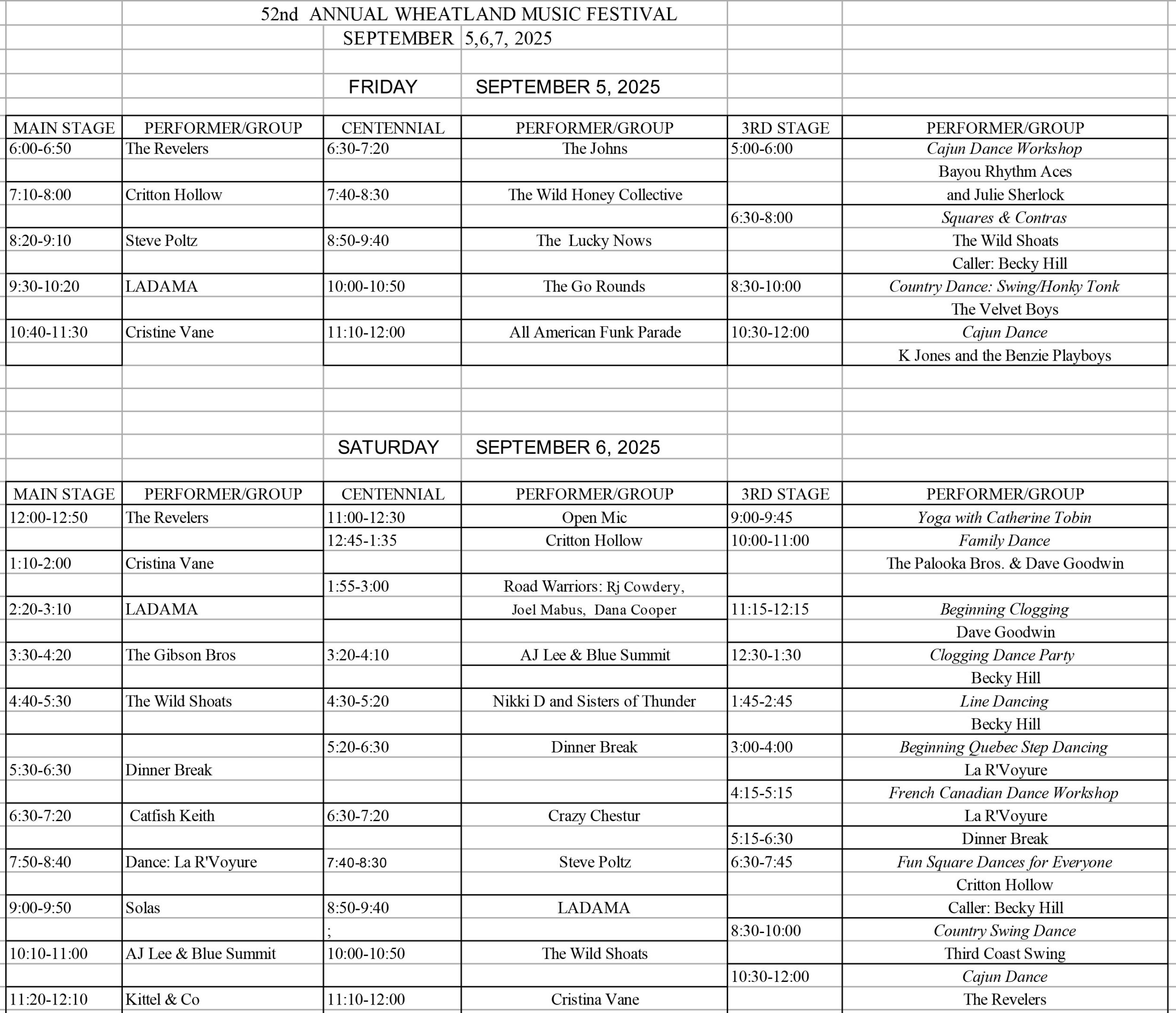 Joyful, camaraderie-filled and musically expansive all could describe the 52nd annual Wheatland Music Festival that runs Friday through Sunday (Sept. 5-7) with performances by international acts such as Steve Poltz, Kittel & Co., Solas, Cristine Vane, The Revelers, Ladama, The Gibson Brothers and AJ Lee & Blue Summit, as well as regional stars K. Jones & The Benzie Playboys, All American Funk Parade, The Wild Honey Collective, The Rebel Eves, Blue Water Ramblers, Hawks & Owls and many more.