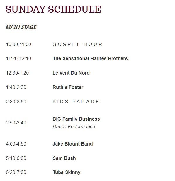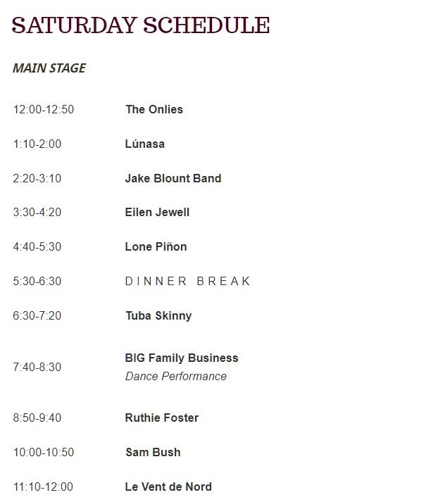 This year’s performers include Ruthie Foster, Sam Bush, Eilen Jewell, Lunasa, Tuba Skinny, Kait Rose & the Thorns, The Gasoline Gypsies, Full Cord and Michelle Held, among others.