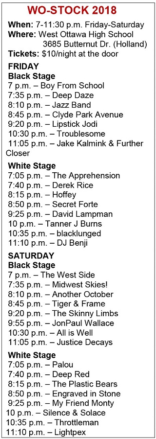 Midwest Skies, Red Legs, Lipstick Jodi, Boy From School, All is Well, Jake Kalmink will join student bands for West Ottawa High School’s annual WO-Stock benefit Friday and Saturday. See the full schedule.