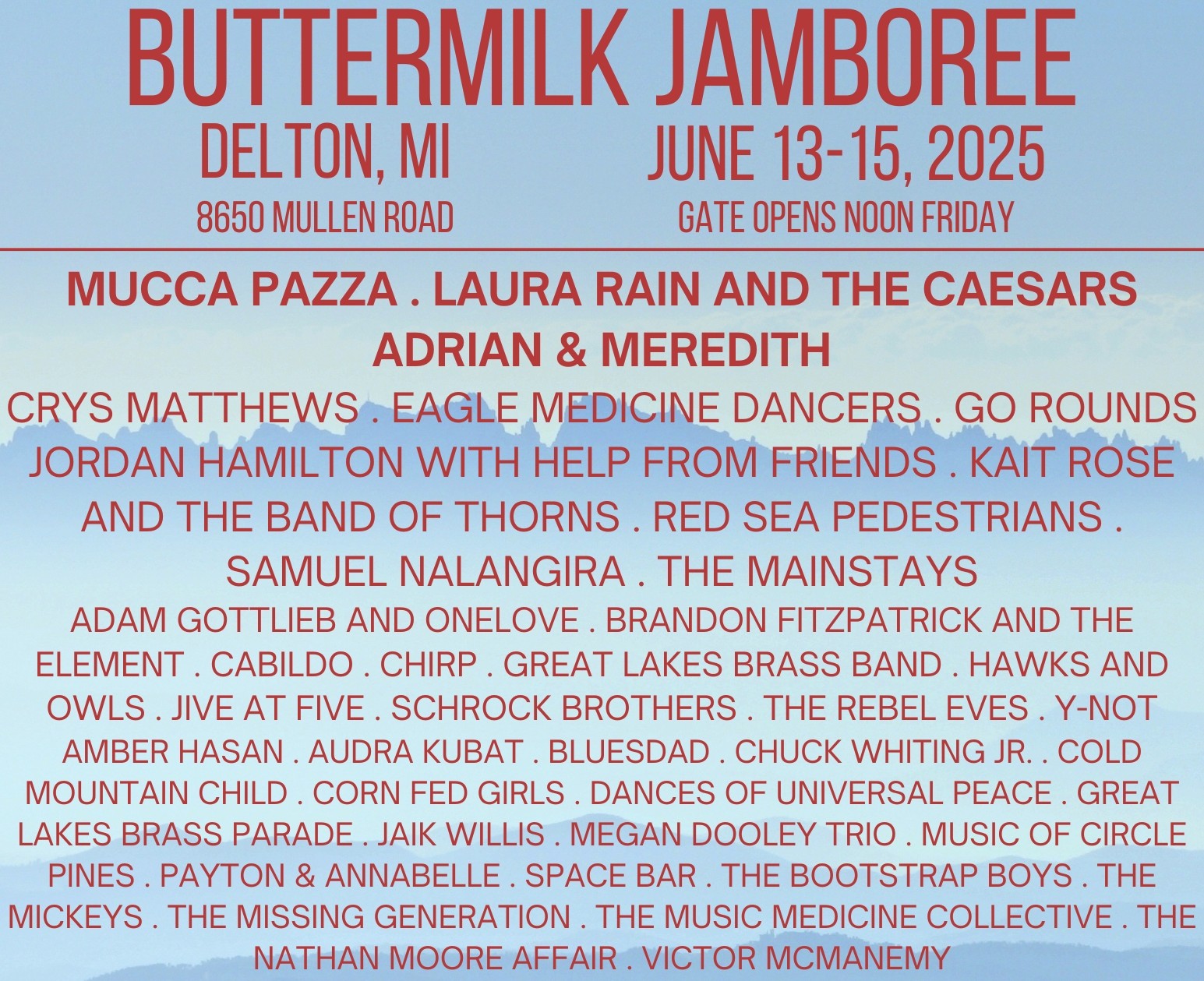 Laura Rain & The Caesars, Mucca Pazza, Jordan Hamilton, Adrian & Meredith, Kait Rose, The Go Rounds and The Red Sea Pedestrians will all perform at the 2025 edition of the Buttermilk Jamboree being staged June 13-15 at Circle Pines Center in Delton, south of Grand Rapids.